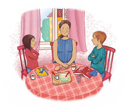 Till slut vände det som tur var (det gör ju alltid det). I början på juli gick jag nämligen en kurs i bilderboksillustration på Sörängens folkhögskola i Nässjö. Vår lärare var den fantastiska Lotta Geffenblad vars bilder och animerade filmer jag alltid älskat och fascinerats av. Vi gjorde massa roliga improvisationsövningar, pratade bilder, läste bilderböcker, ritade och målade. Det var så förlösande att inte vara så noggrann, att bara rita på utan att tänka så mycket. När jag kom hem gick det lätt att sätta igång, bilderna kom av sig själv. Lotta fick sen stå som förebild till mammans utseende i boken, inte för att hon verkade hästrädd utan bara för att hon ser så snäll och sympatisk ut!